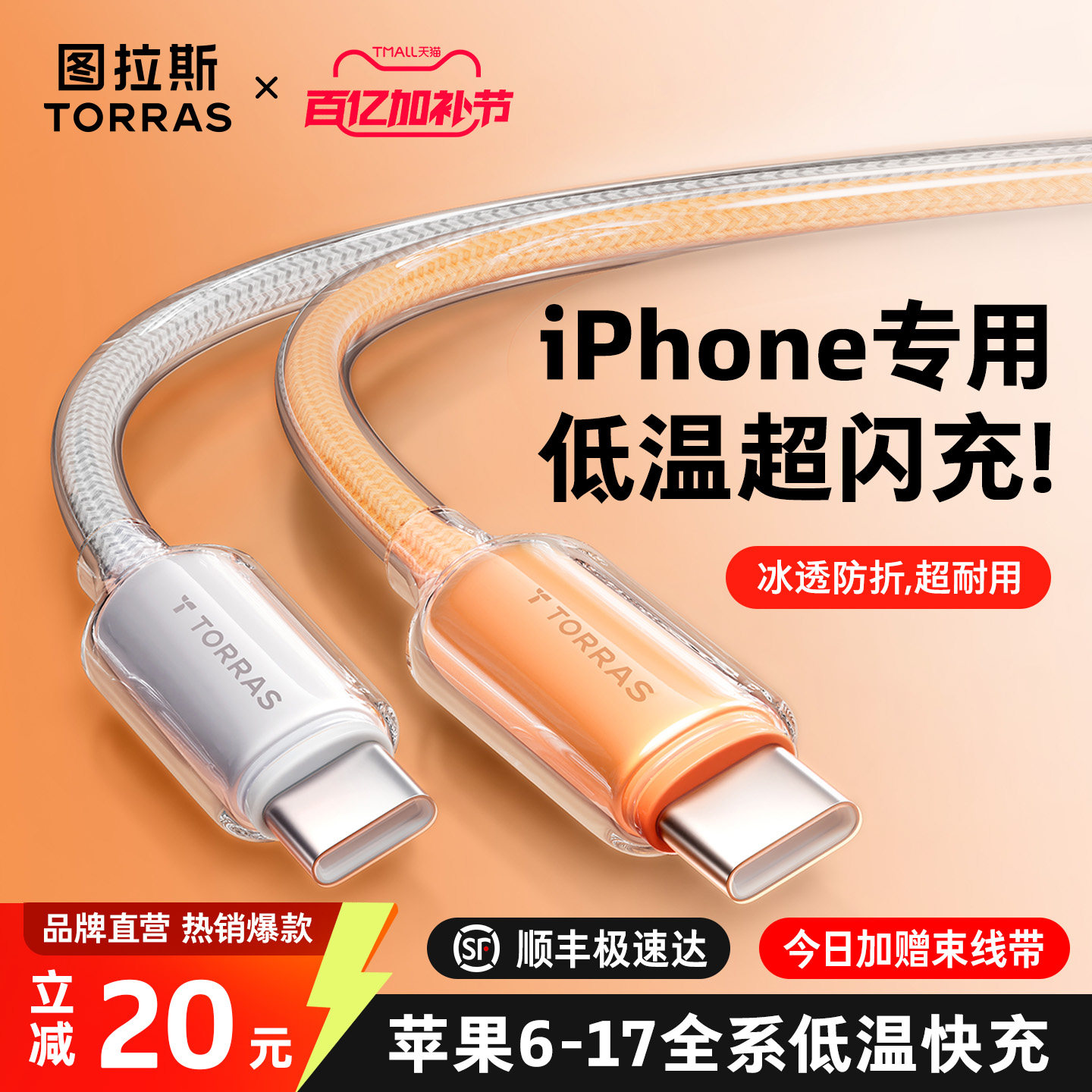 图拉斯小冰线充电线适用苹果17ProMax数据线iPhone16快充线15手机双typec车载14三合一PD正品13平板iPad器USB