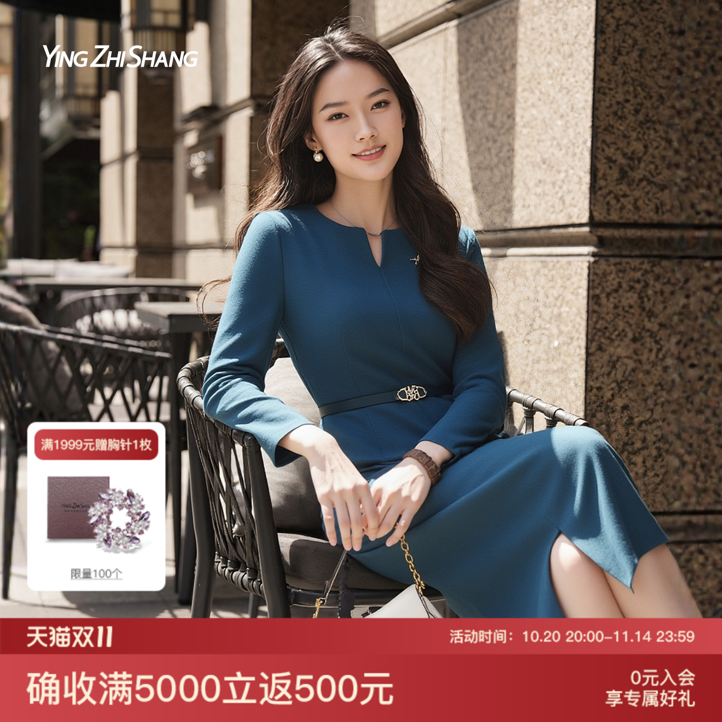 【100绵羊毛】赢智尚连衣裙秋季新款高级感气质蓝色显瘦职场裙子
