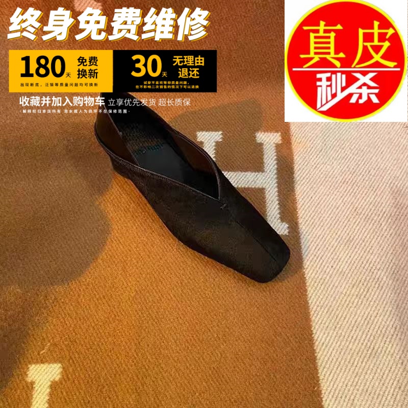 中跟方头单鞋女百搭真皮浅口通勤绒面粗跟奶奶鞋气质高级平底瓢鞋