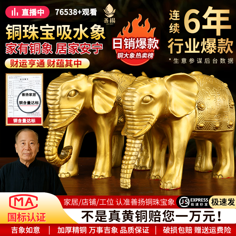 铜大象摆件一对招财纯黄铜吸水象吉祥物家居电视酒柜办公室装饰品