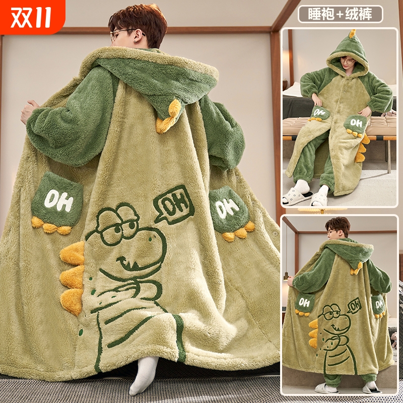 特大码300斤睡衣男秋冬珊瑚绒中长睡袍加绒加厚宽松学生家居服