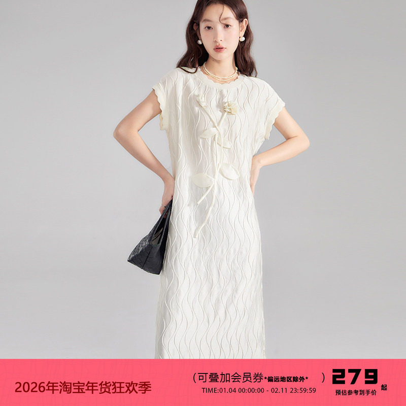 有耳uare原创设计 未闻花名 立体手工花波浪缎面压褶直筒连衣裙