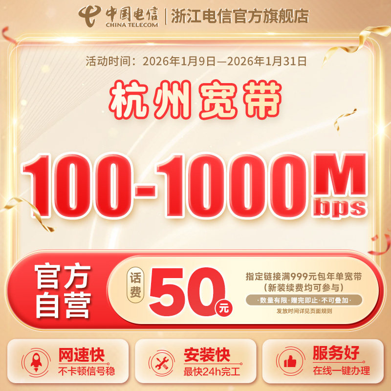 中国电信宽带杭州电信宽带办理官方上门安装wifi浙江宽带续约100M