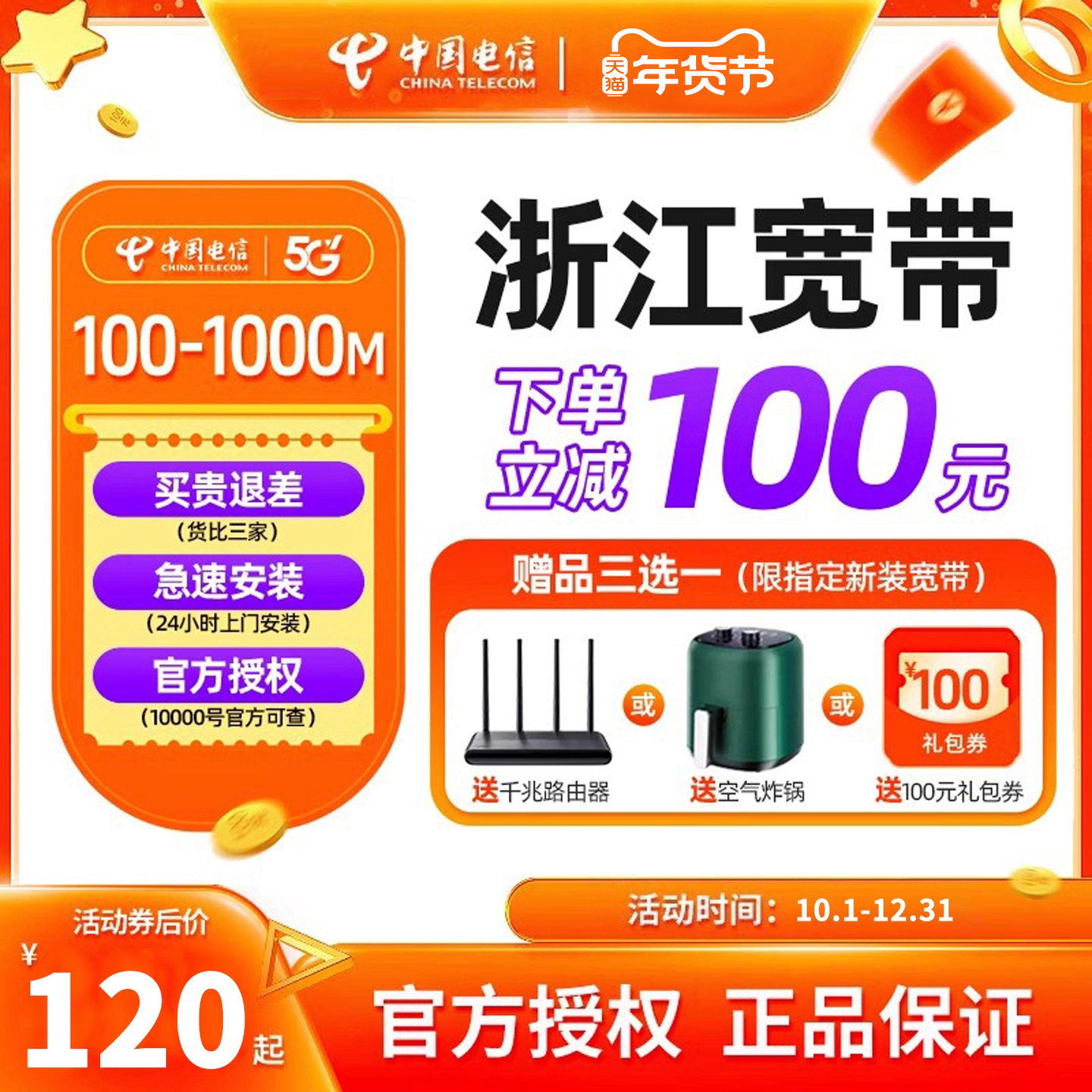 中国电信宽带杭州电信宽带办理官方上门安装wifi浙江宽带1000M