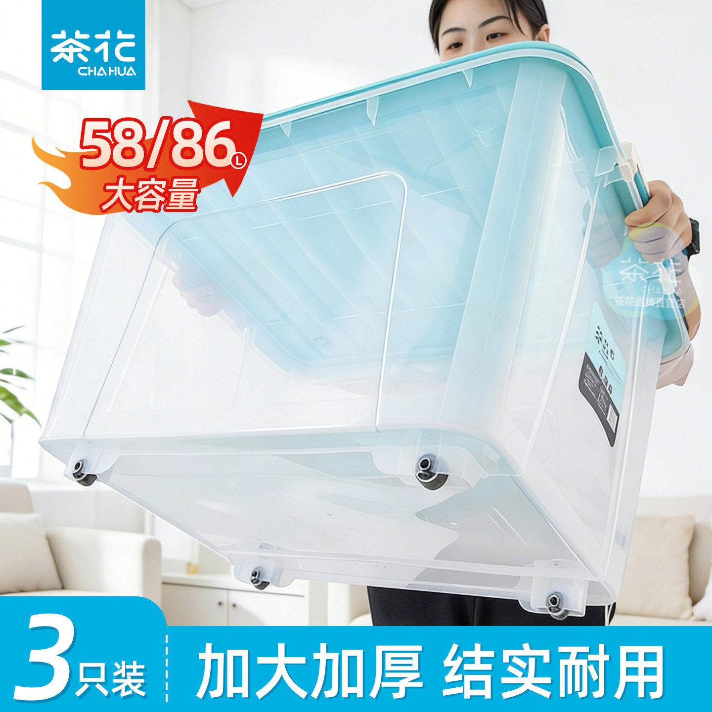 茶花家用大容量收纳箱塑料加厚杂物衣服被子带滑轮塑料箱大整理箱