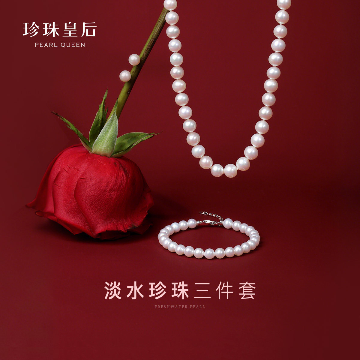 珍珠皇后 淡水珍珠项链颈链手链耳饰组合满珠链三件套送女友礼盒