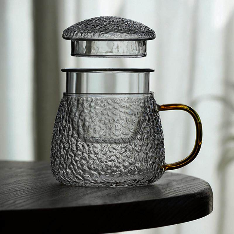 玻璃水杯茶水分离泡茶杯茶道杯锤纹日式花耐热有盖办公室杯子带把