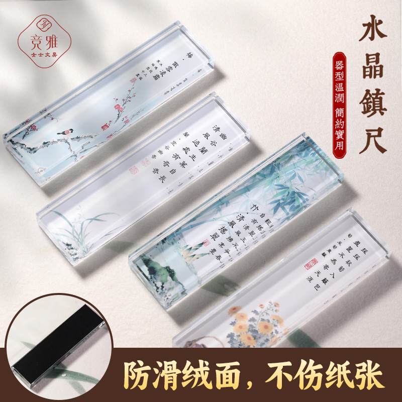 竞雅水晶玻璃镇纸镇尺国风创意彩绘书法镇纸摆件压纸压书文房四宝书法专用镇尺高颜值送礼佳品