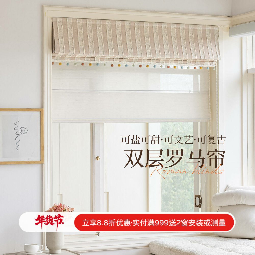 26年新款法式奶油ins风竖条纹儿童房双层罗马帘书房飘窗升降窗帘