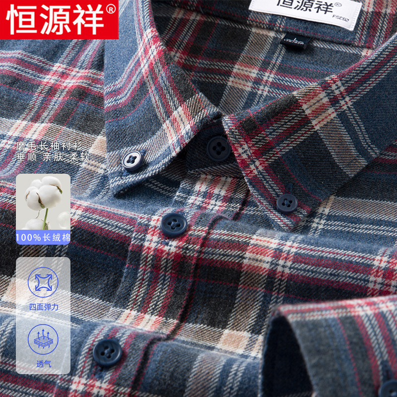 [纯棉磨毛]恒源祥衬衫男长袖春秋新款休闲格子中老年爸爸全棉衬衣