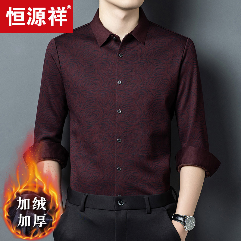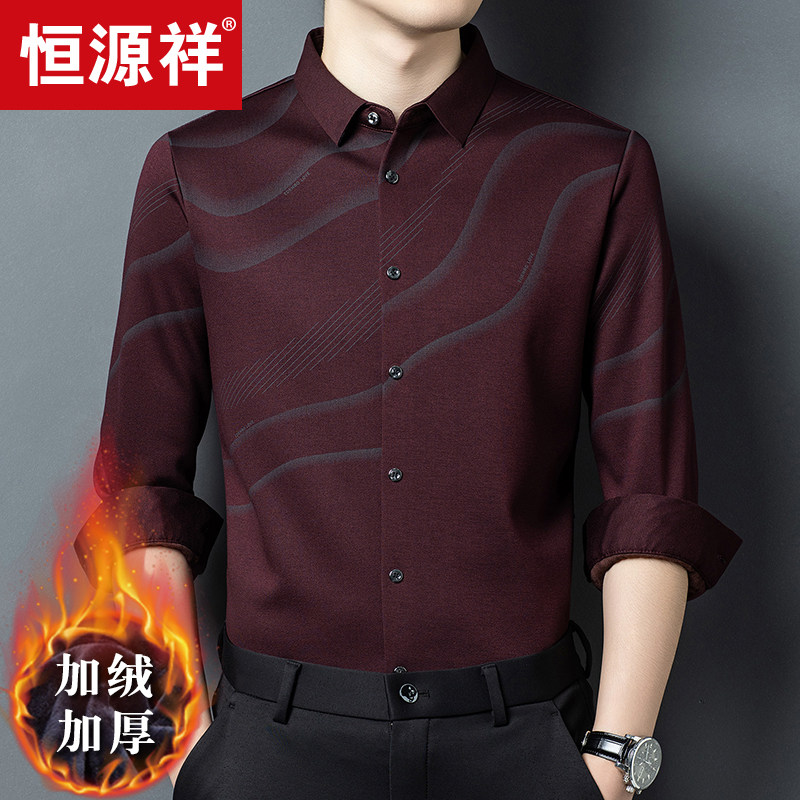 恒源祥高档无痕衬衫男秋冬款中年抗皱免烫加绒衬衣长袖大码寸衫男