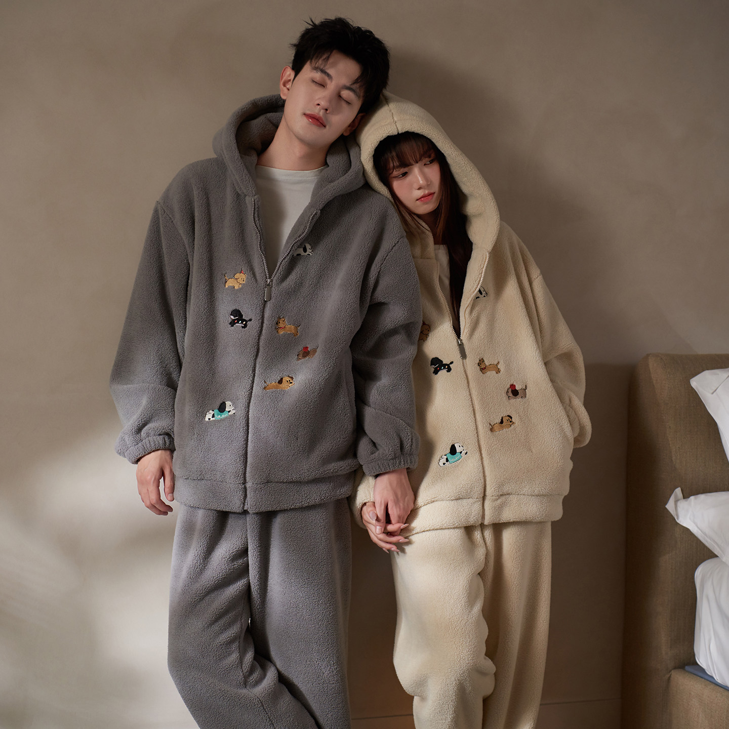 马克公主情侣连帽拉链睡衣女冬季可爱韩系羊羔绒加厚出门家居服男