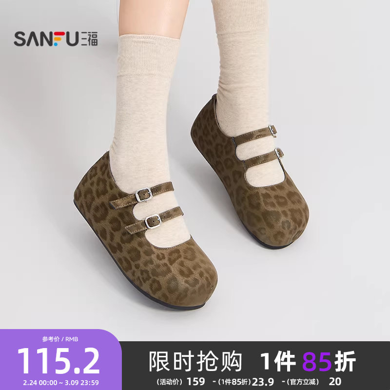 三福女单鞋春季都市豹纹花纹双条带内增高娃娃鞋女鞋854804