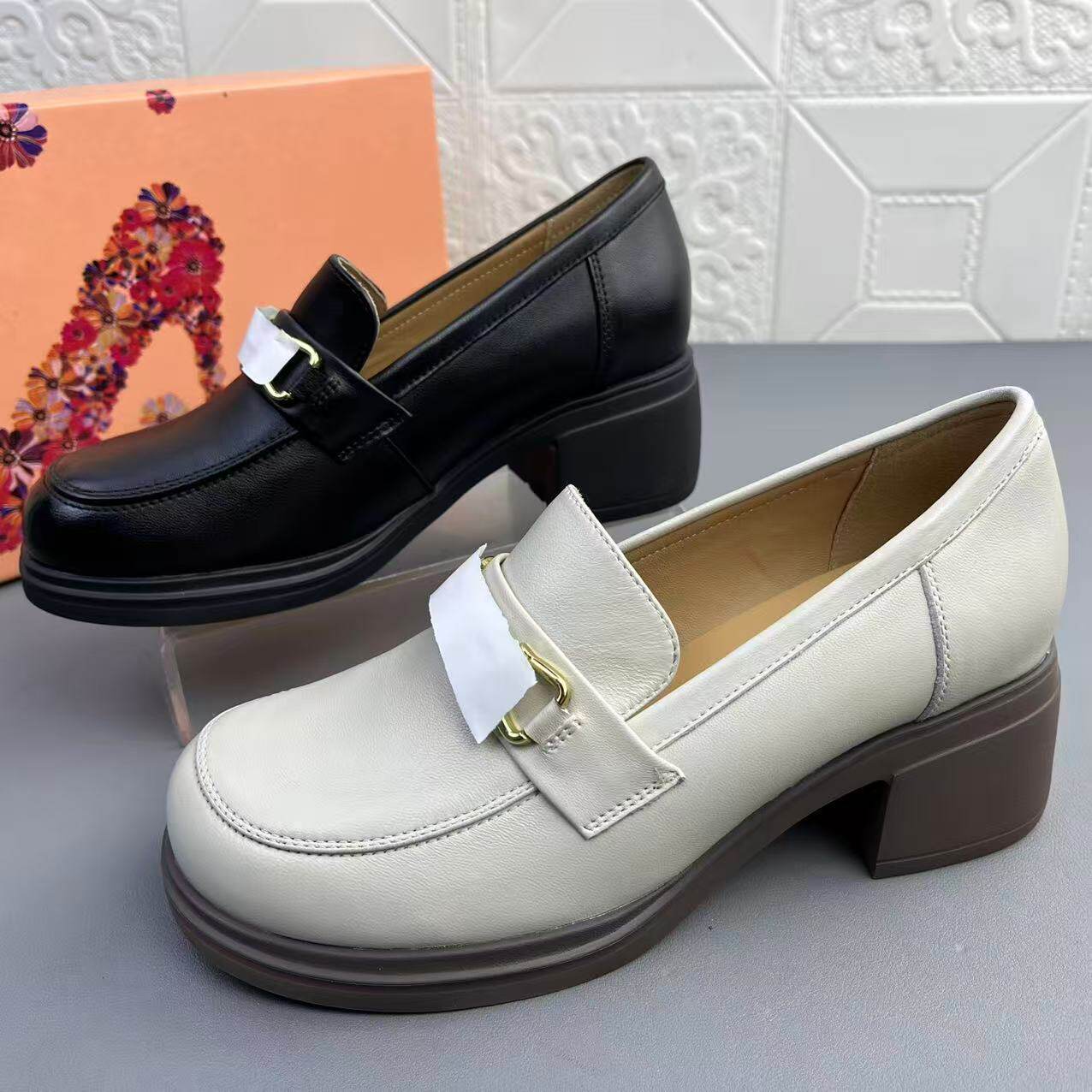 奥莱撤柜处理时尚羊皮乐福鞋女鞋真皮新款粗跟防滑耐磨浅口单鞋清