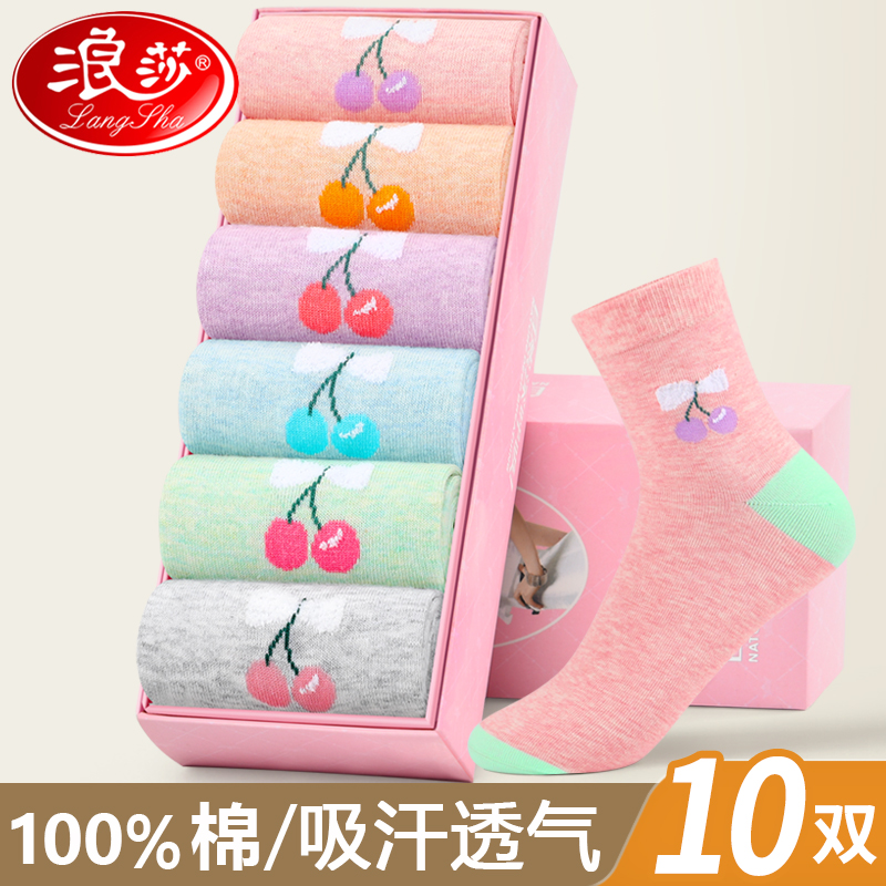 浪莎女袜子纯棉袜女短袜透气纯棉袜运动休闲全棉春秋冬中筒棉袜子