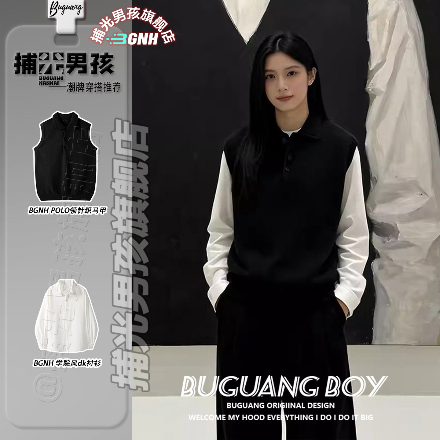 韩版休闲polo领针织衫时尚马甲衬衫套装春季老钱风叠穿毛衣男背心