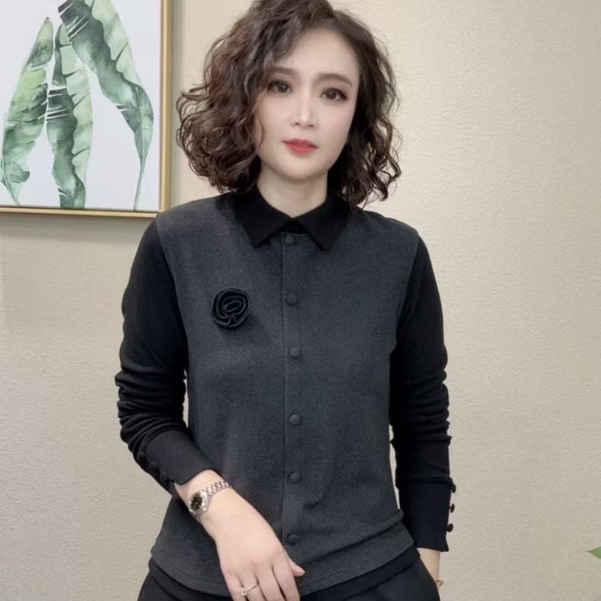 2025秋季新款中年妈妈时尚拼接翻领长袖刺绣T恤女休闲打底衫上衣