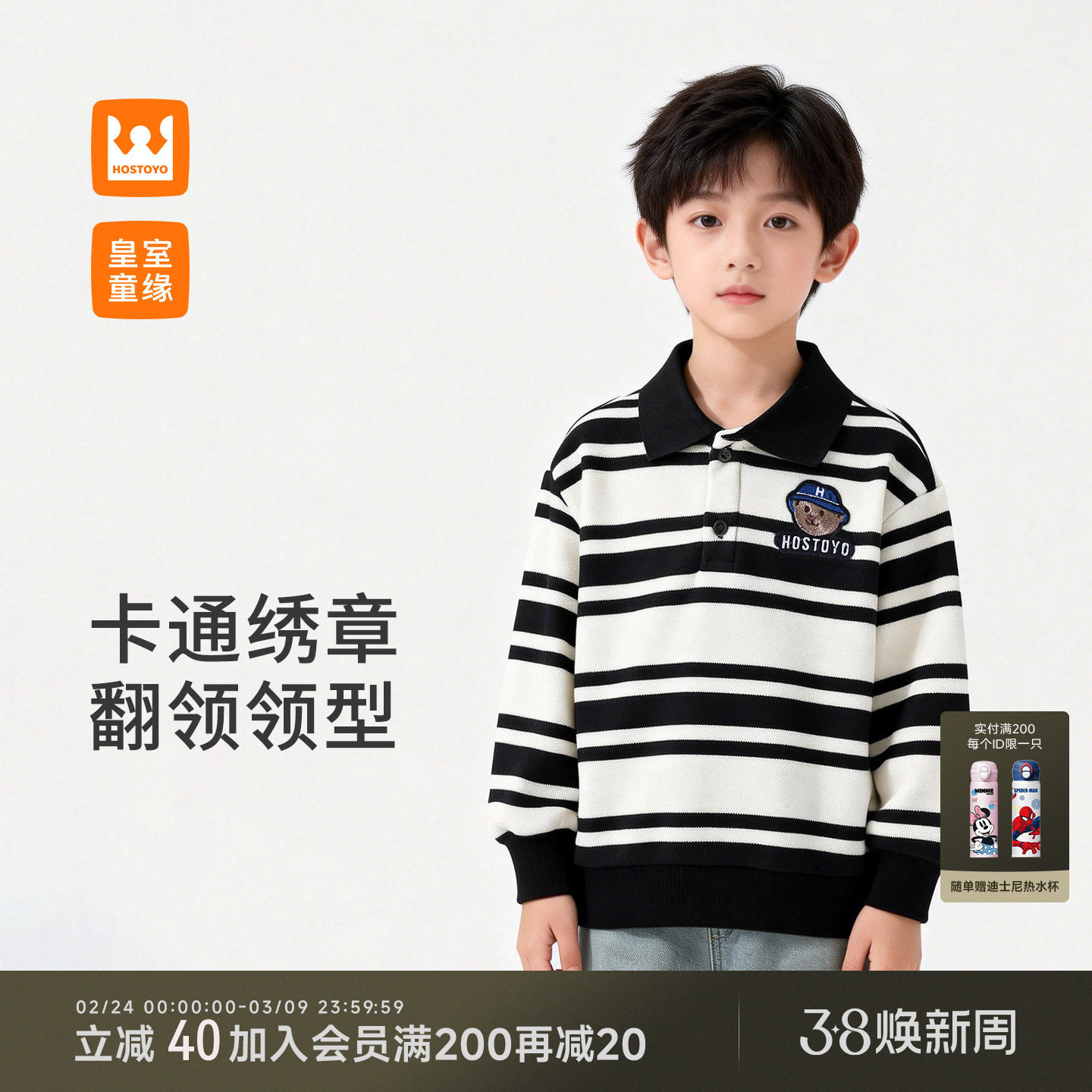 皇室童缘男童polo领加绒加厚卫衣冬季新款儿童卡通条纹上衣中大童