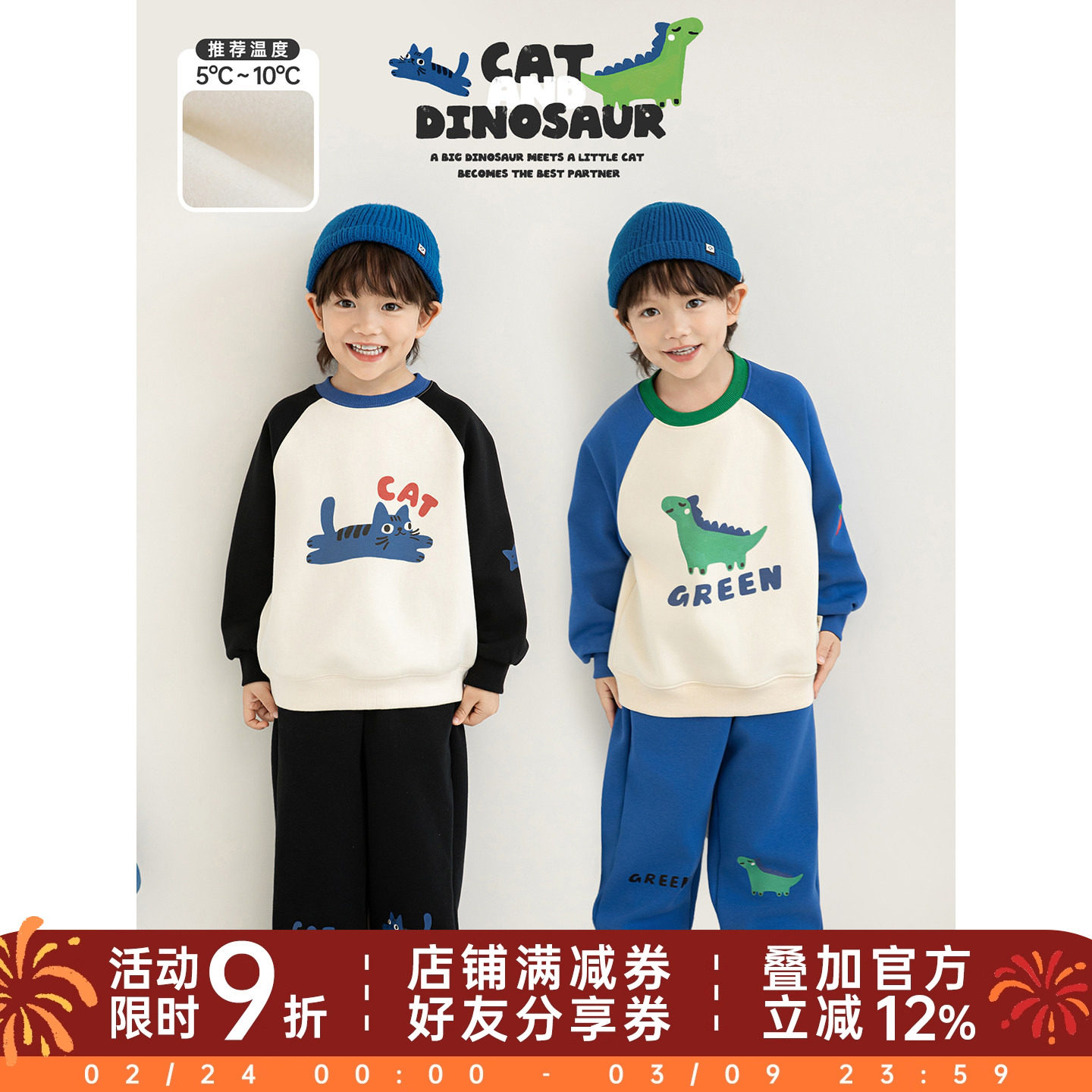 幼悠男童加绒加厚恐龙系列套装2025冬季新款儿童休闲卡通卫衣卫裤