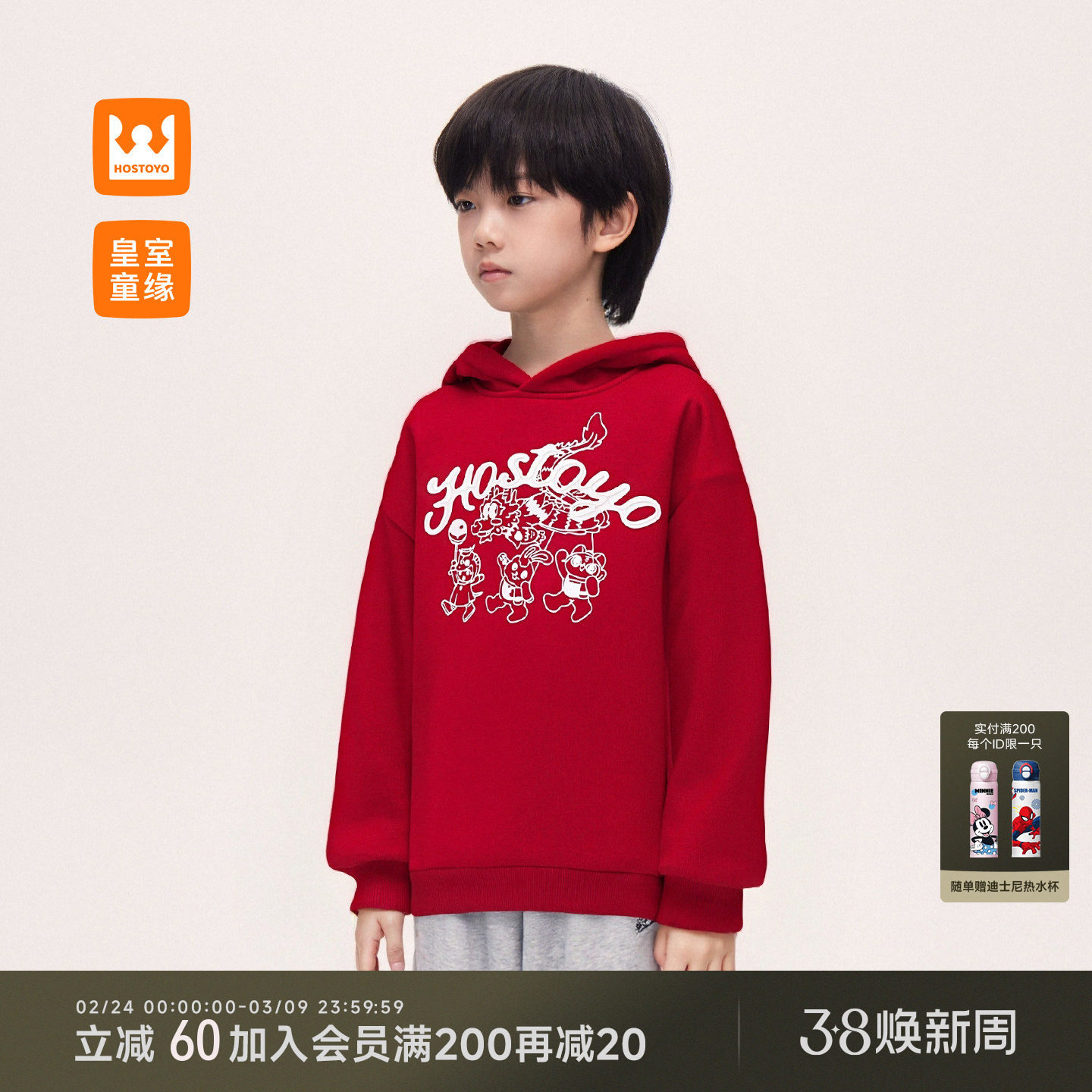 皇室童缘男童新年红色连帽卫衣2025冬季新款儿童加绒加厚卡通上衣