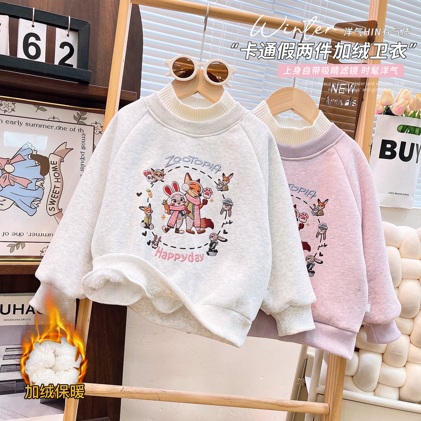 男女童加绒加厚卫衣2026冬季新款中大童卡通印花假两件百搭上衣潮