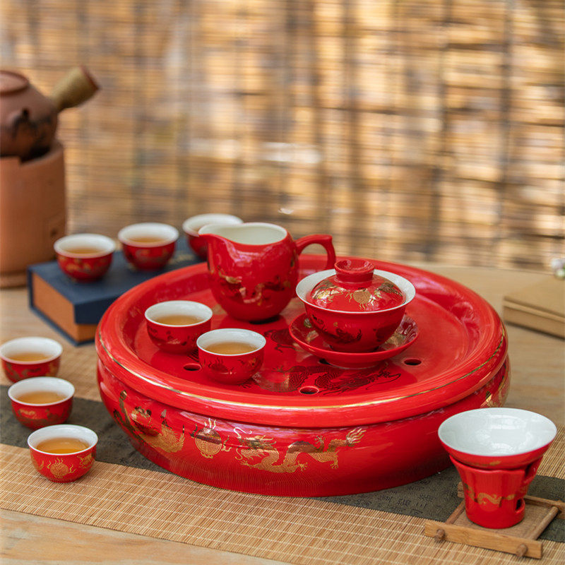 中式红色国庆礼品黄色金龙凤呈祥工夫茶具套装陶瓷茶盘泡茶杯盖碗
