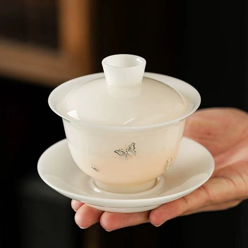 可悬停旋转盖碗茶杯茶具单个高档羊脂玉三才带盖子茶碗泡茶手抓壶