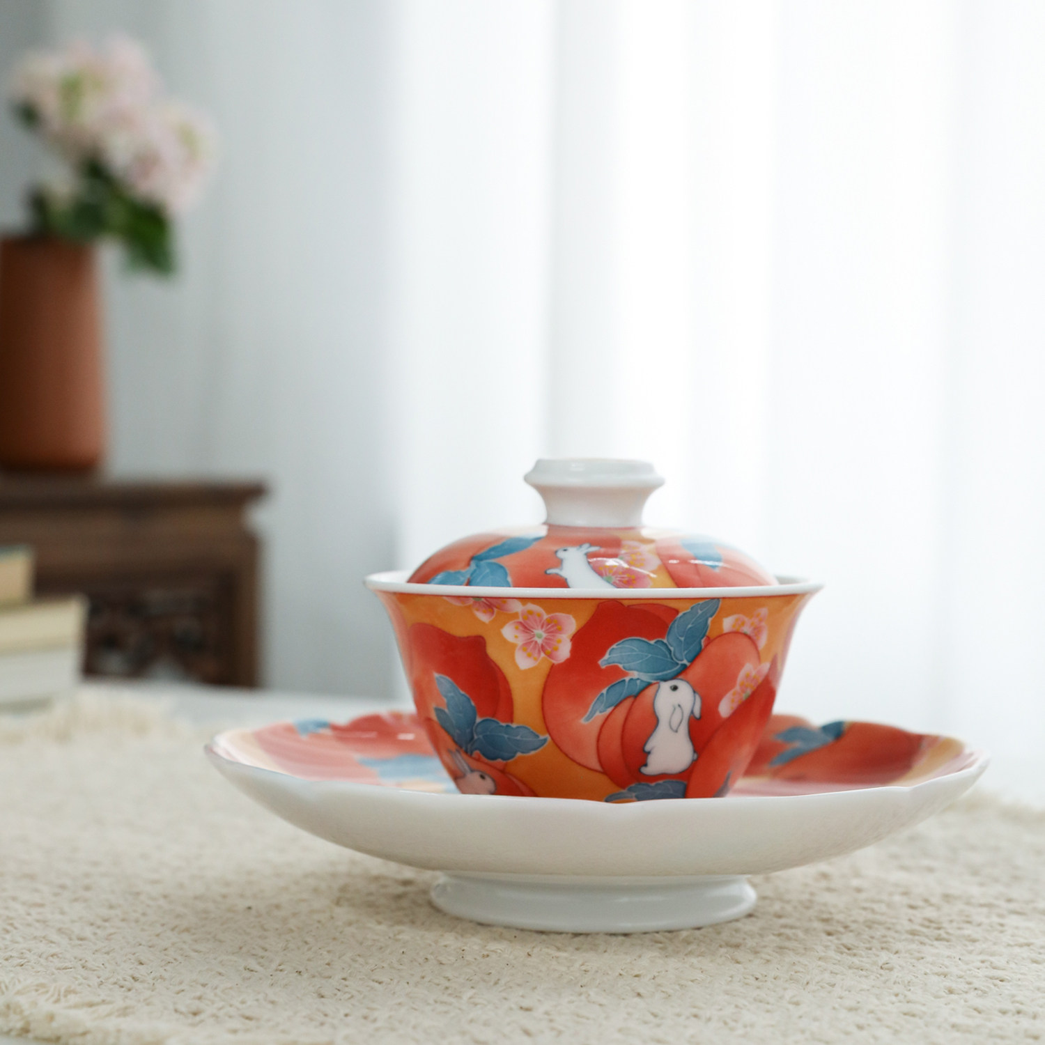 官润窑釉下彩手绘陶瓷高档功夫泡茶杯盖碗品茗主人杯壶承女士寿桃