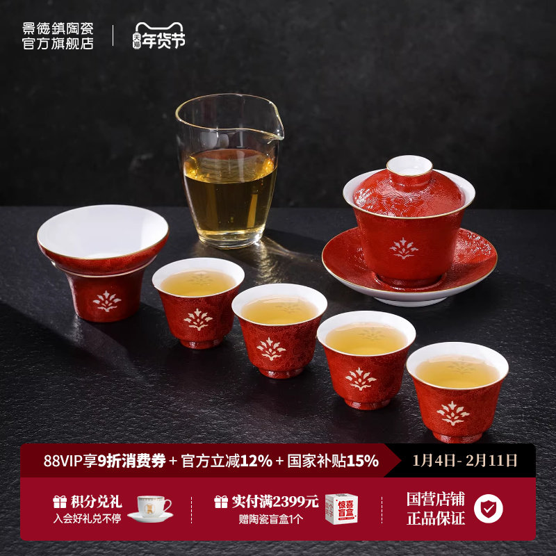 景德镇官方手工扒花玲珑陶瓷茶具茶杯盖碗套装结婚送礼高档礼盒装