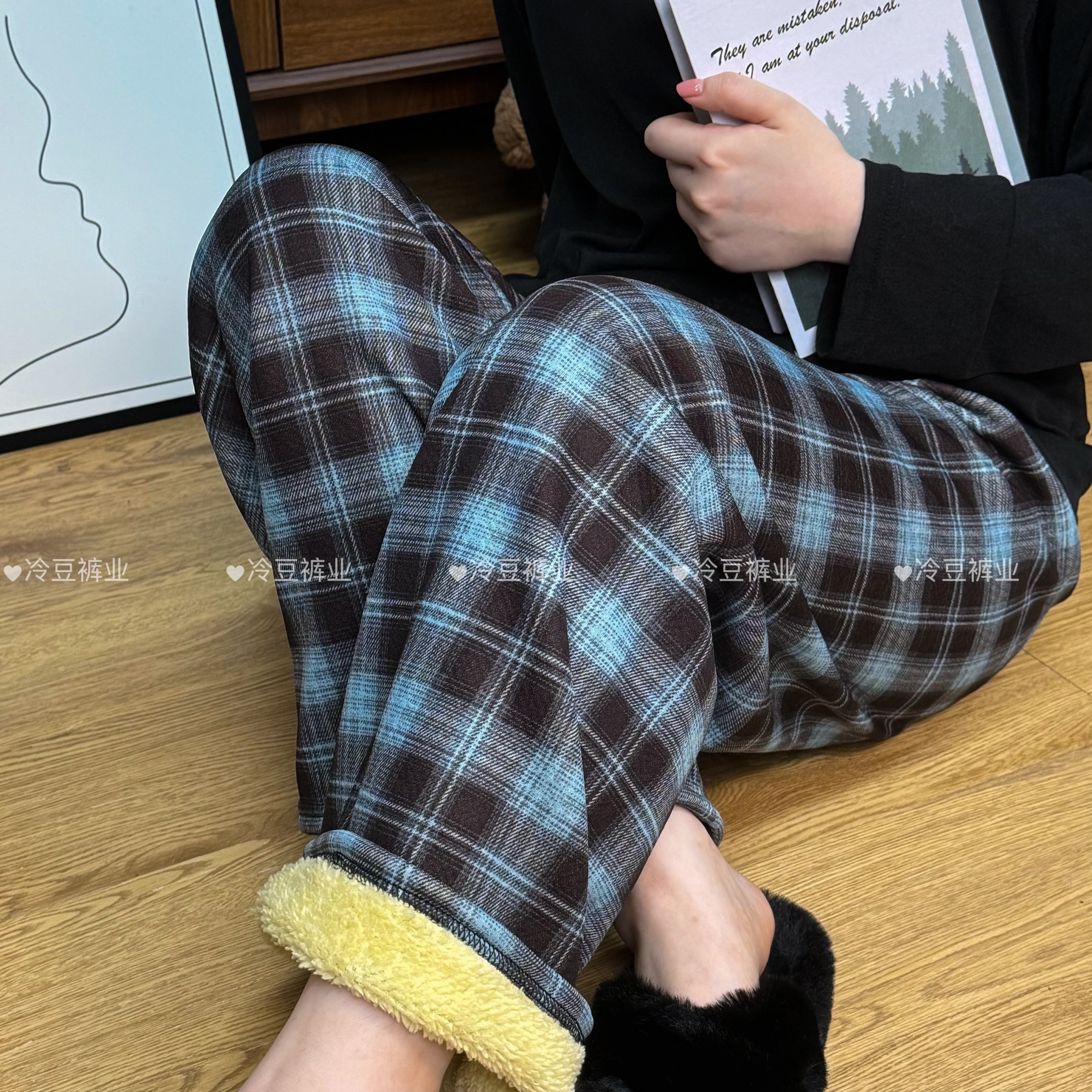 新款羊羔绒加绒格子裤秋冬直筒裤显瘦中高腰宽松长裤阔腿裤家居裤