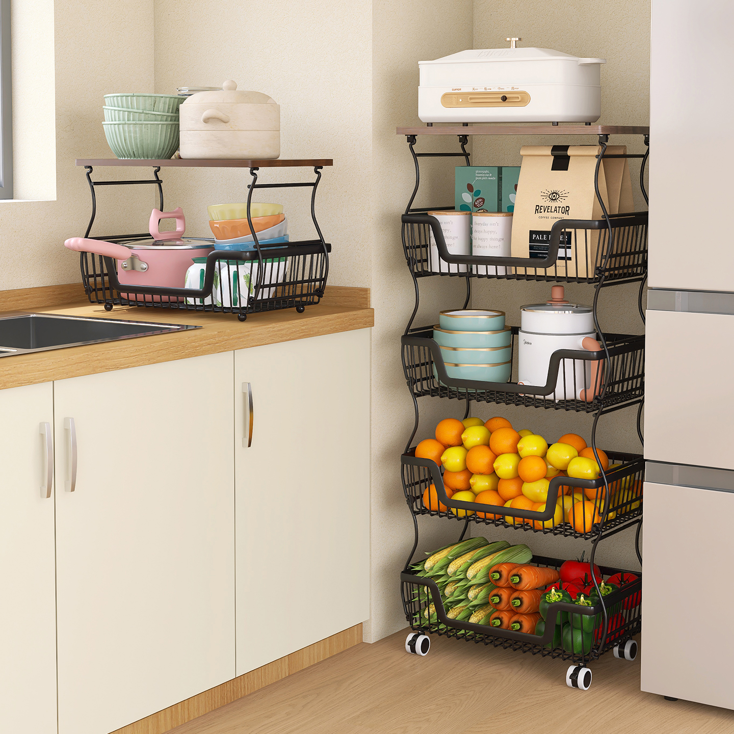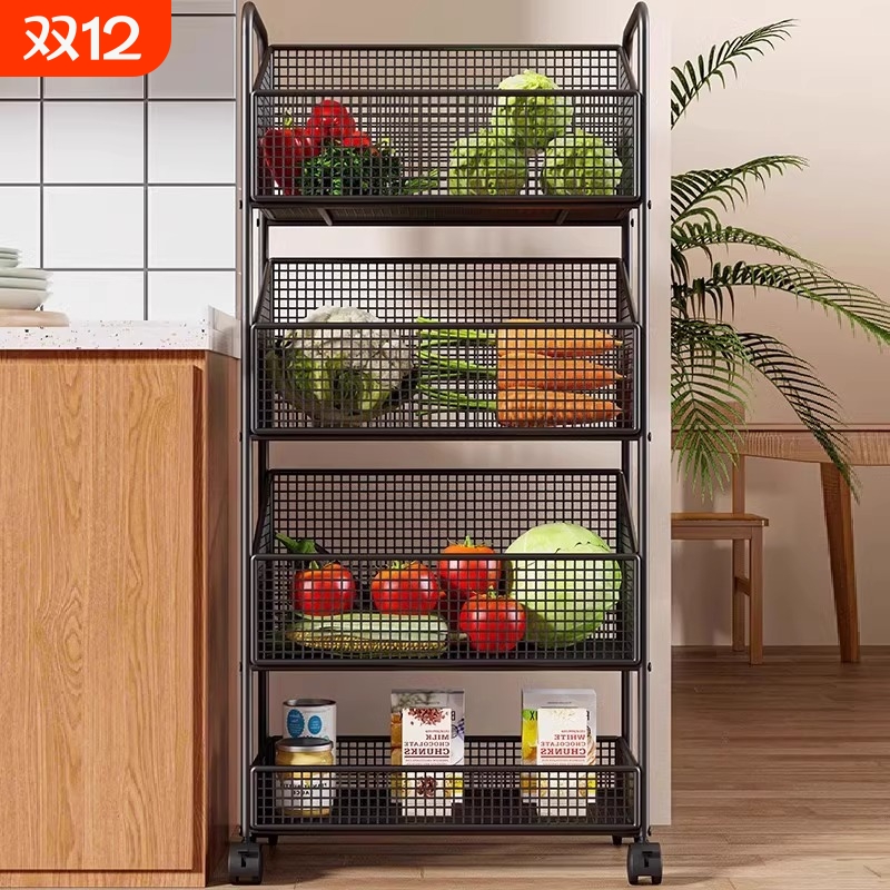 厨房蔬菜置物架落地式菜篮子靠墙移动收纳架家用多功能零食储物篮