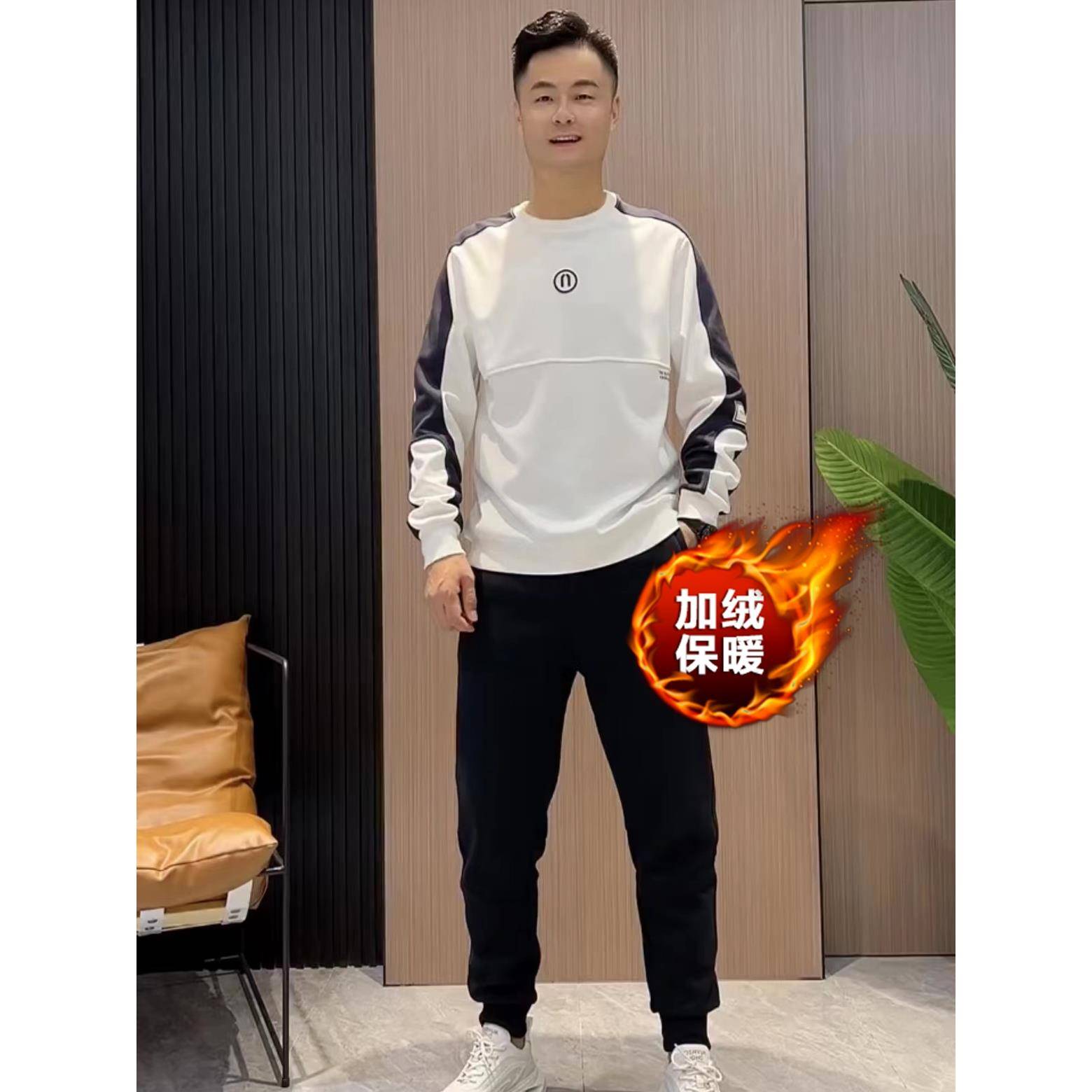 男士秋冬装圆领加绒加厚长袖T恤中青年潮流印花卫衣保暖打底小衫