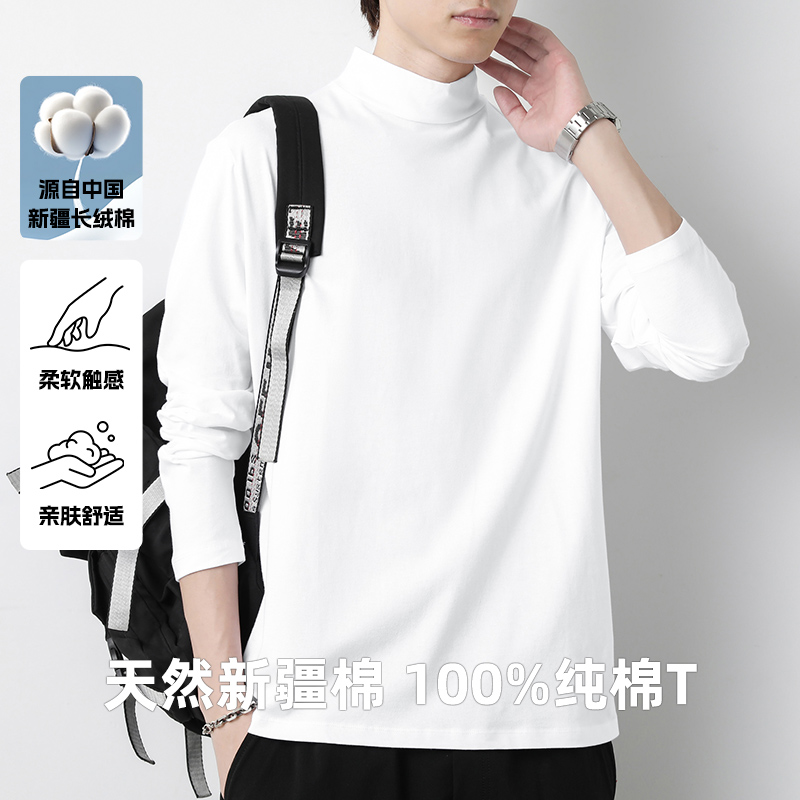 纯棉t恤男长袖秋冬季半高领内搭纯色白色打底衫全棉中领秋衣小衫
