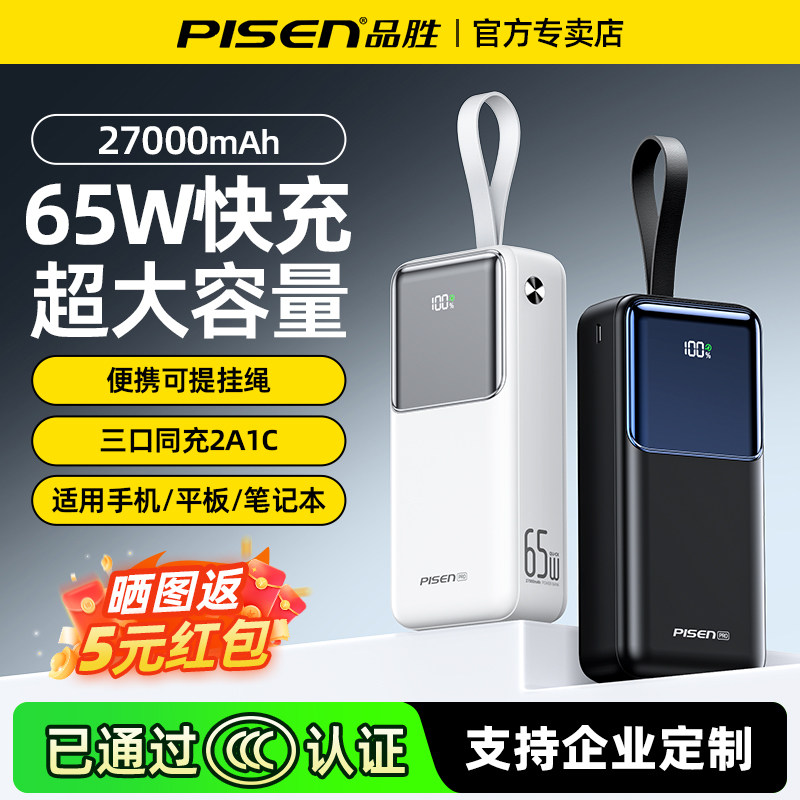 品胜3C充电宝60000毫安65W超级快充大容量认证手机投影仪露营户外官方旗舰店正品移动电源适用华为小米苹果17