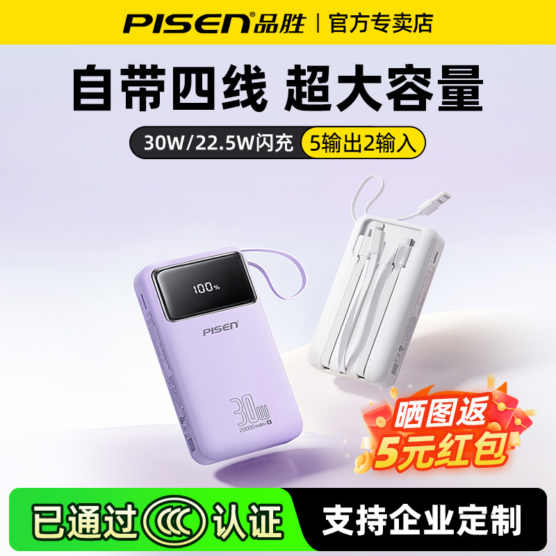 品胜充电宝20000毫安自带四线定制logo快充超薄迷你超大容量移动电源适用华为小米苹果17P手机3C认证可上飞机