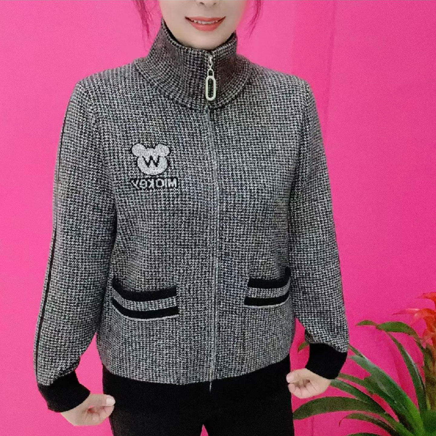 时尚中年妈妈装长袖针织开衫女秋季新款宽松休闲百搭双兜拉链外套
