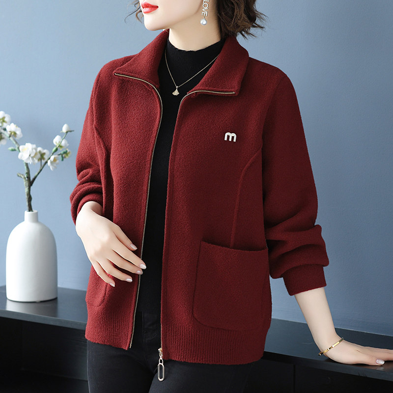 妈妈装秋冬新款翻领拉链针织开衫中年女短款毛呢外套洋气时尚上衣