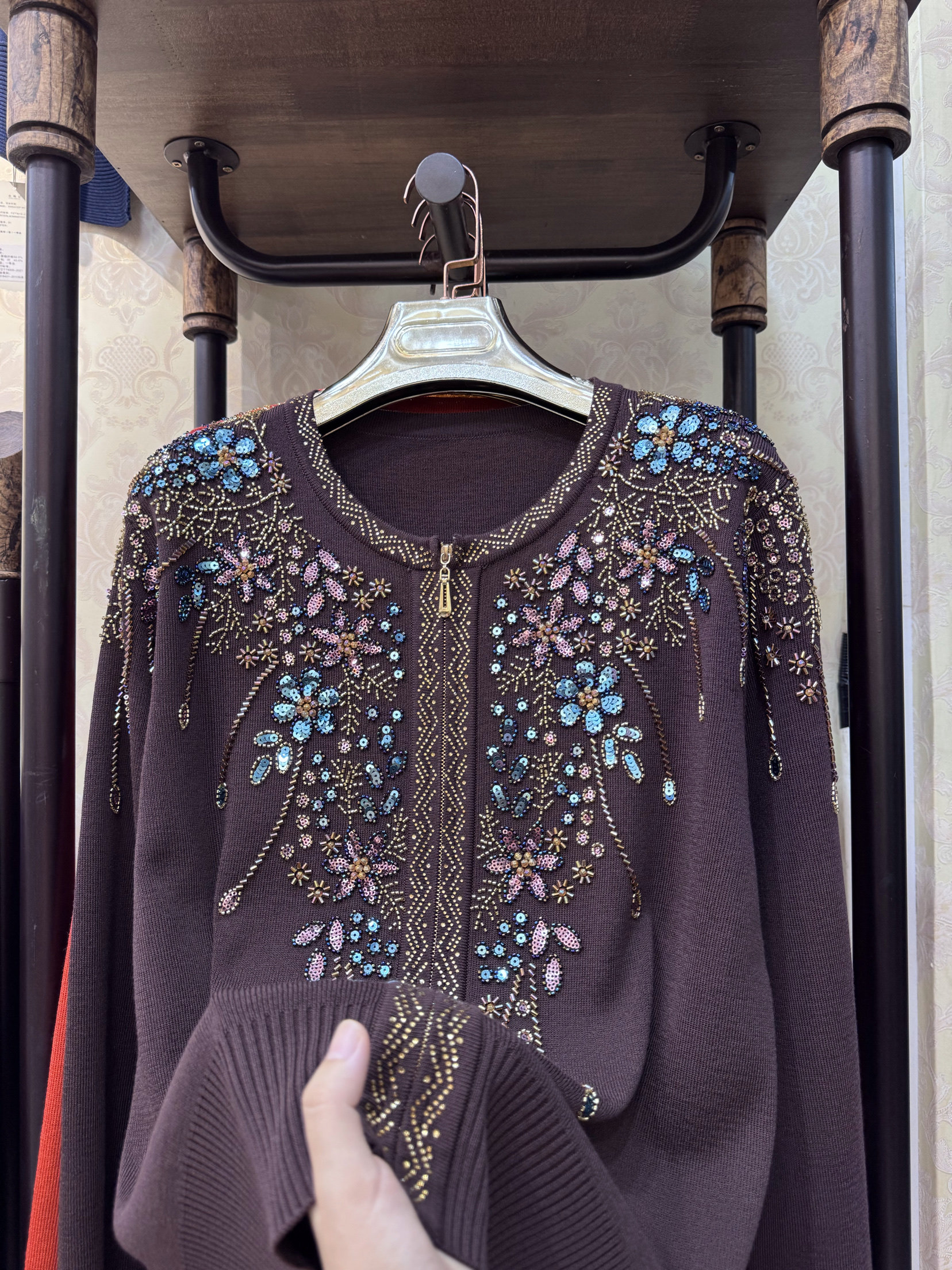 专柜高端重工亮片手工绣花针织开衫黑色圆领拉链显瘦中年妈妈外套