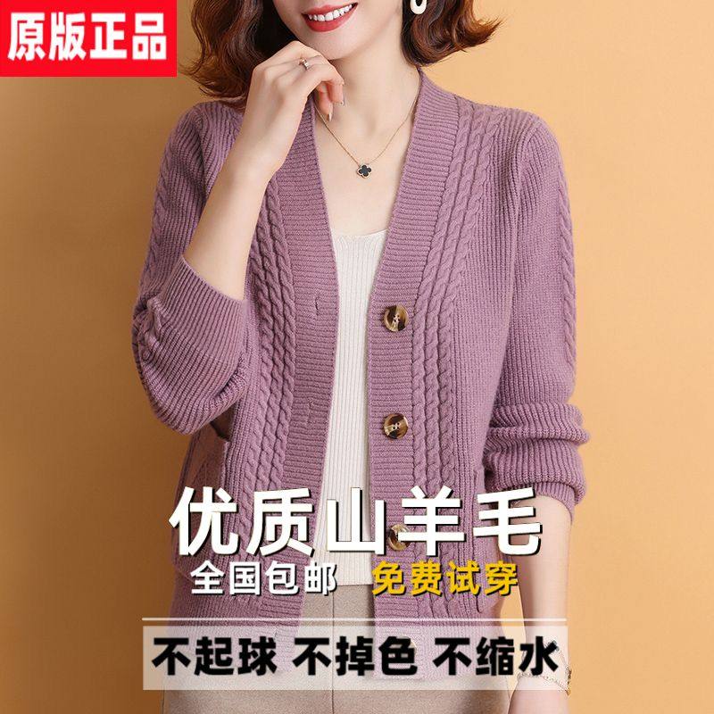 100%纯羊毛针织开衫女春秋中年妈妈装时尚大码宽松百搭上衣小外套