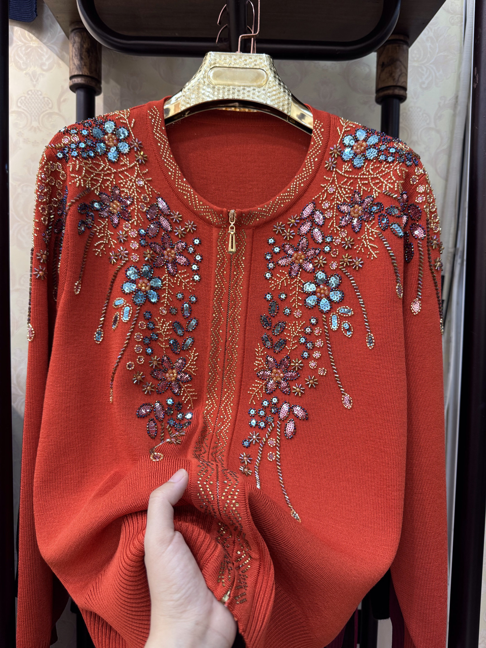 正版高端重工亮片手工绣花针织开衫黑色圆领拉链显瘦中年妈妈外套