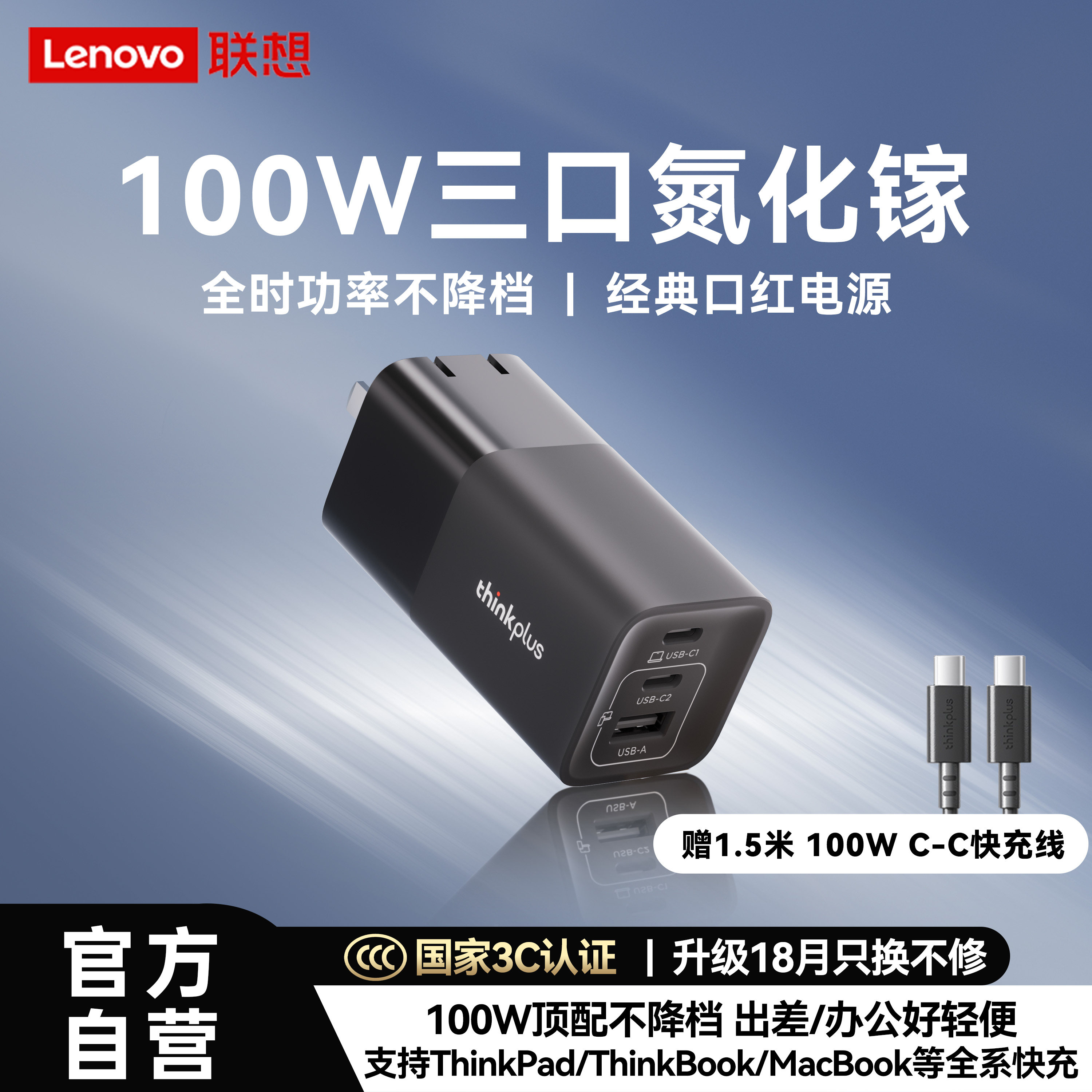 【不降功率】联想ThinkPlus氮化镓100W充电器适配苹果笔记本pd快充头电脑ThinkPad小新thinkbook口红电源手机