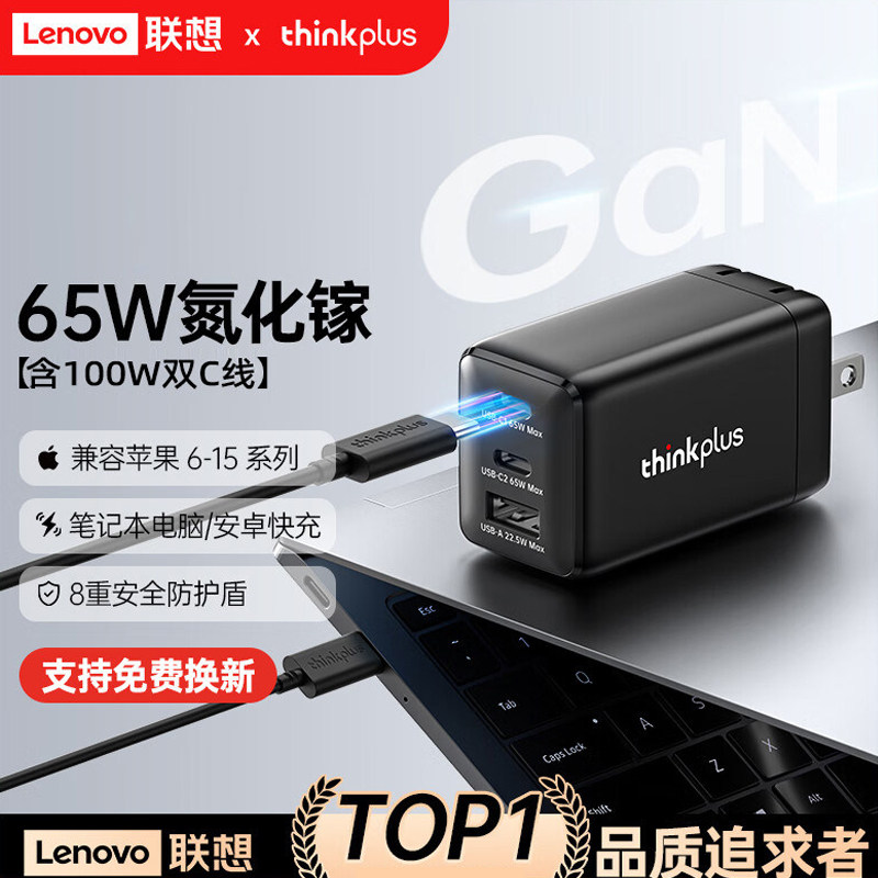 联想ThinkPlus65W氮化镓充电器头多口PD快充typec40/45W适配苹果17MacBook笔记本电脑ThinkPad手机口红电源