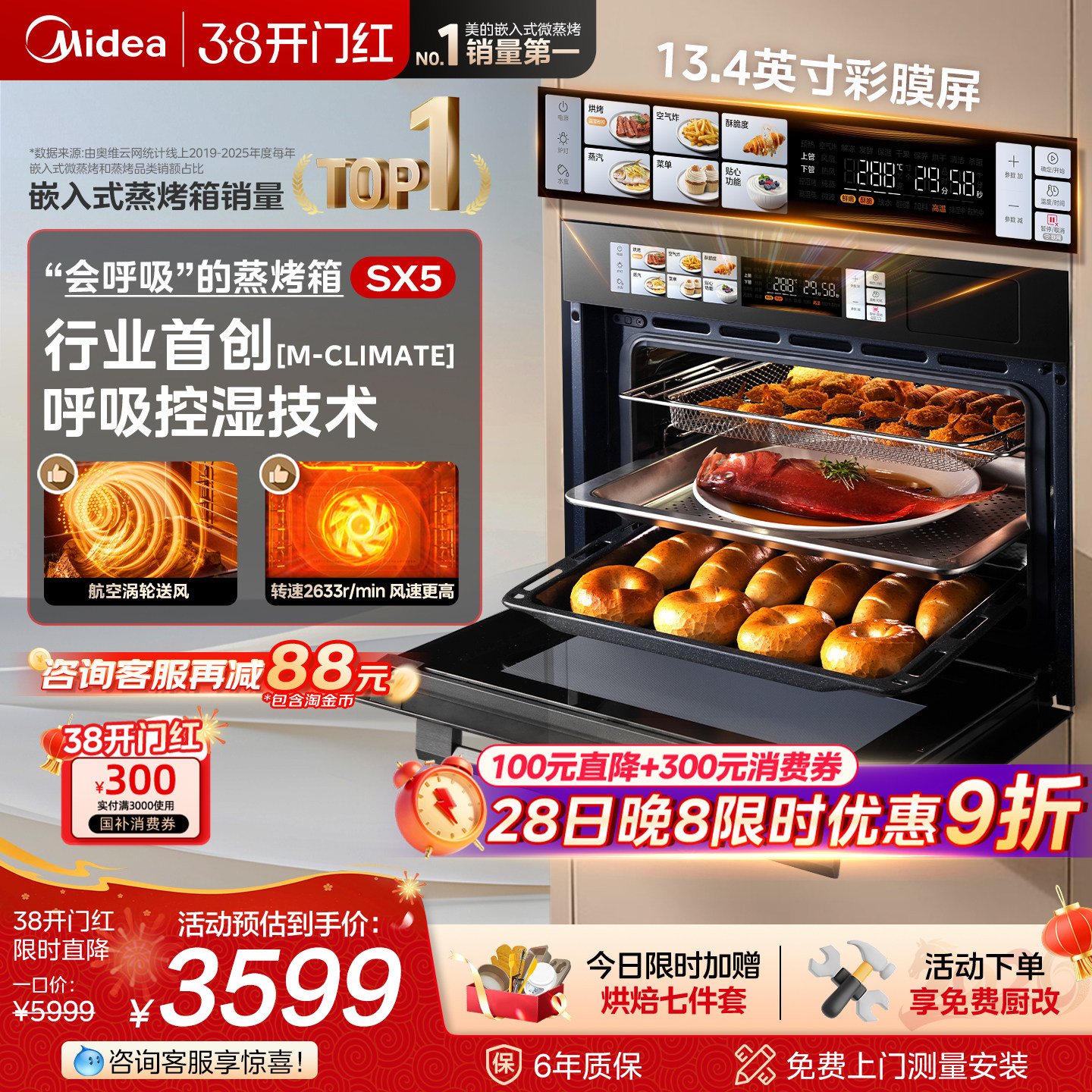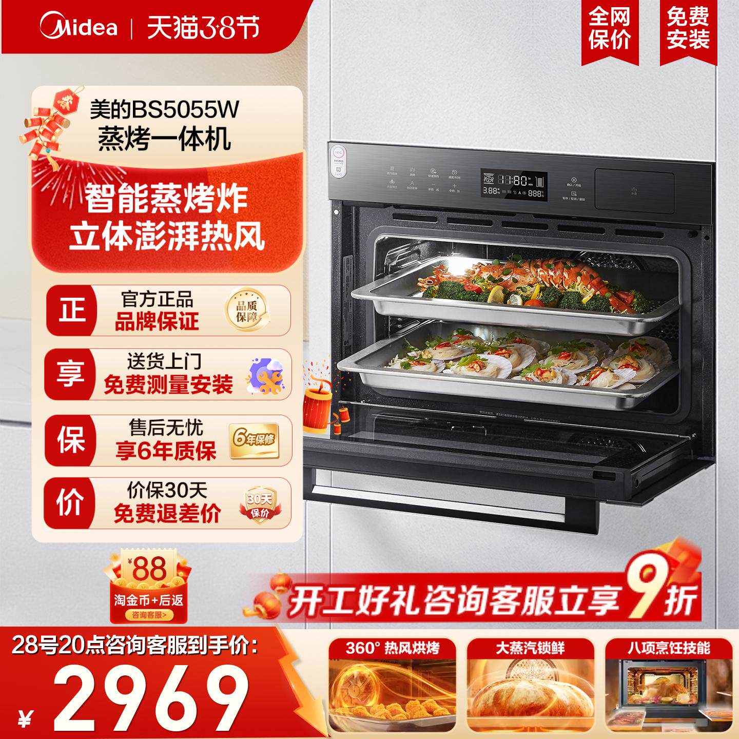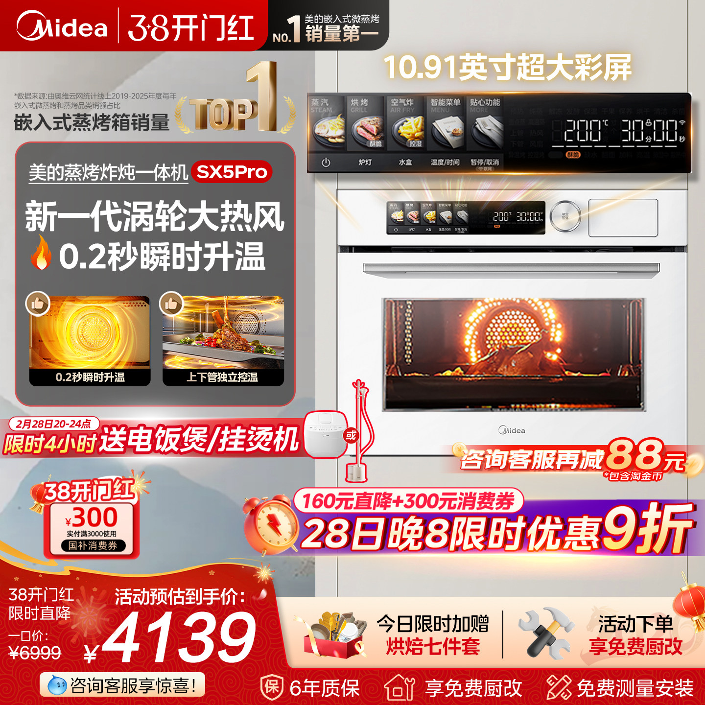 [热销爆款]美的SX5Pro蒸烤一体机嵌入式蒸烤箱家用智能电蒸箱白色