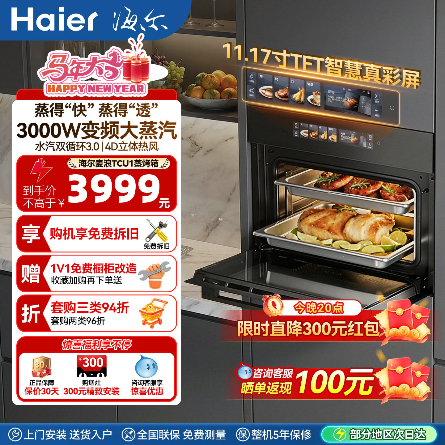 海尔麦浪蒸烤箱C50-TCU1蒸烤一体机嵌入式家用蒸箱[3000W大蒸汽]