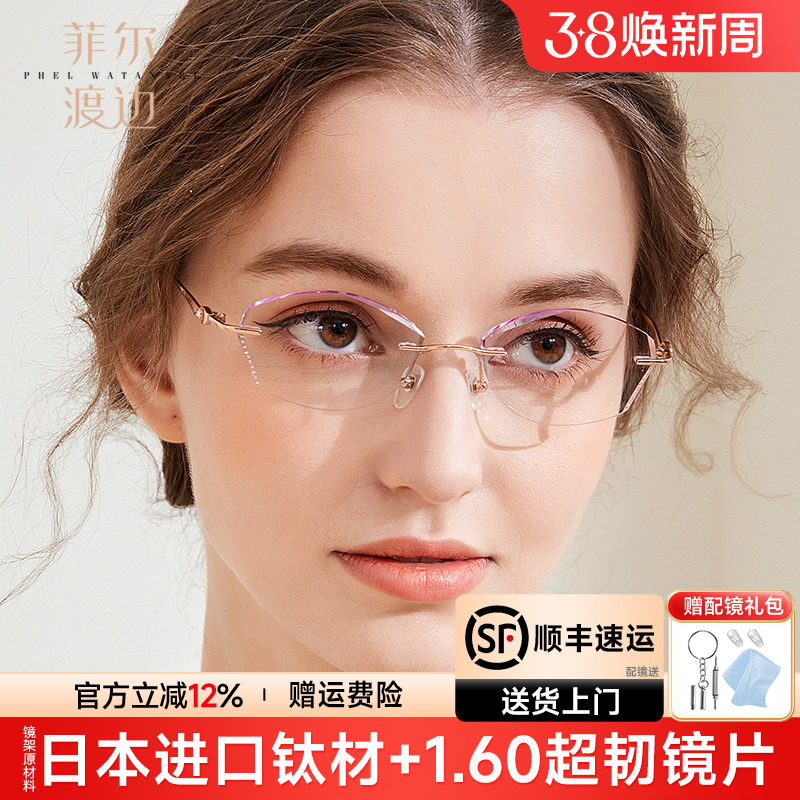 魅影无框切边眼镜近视超轻钛架眼镜女可配度数大脸素颜显脸F3910