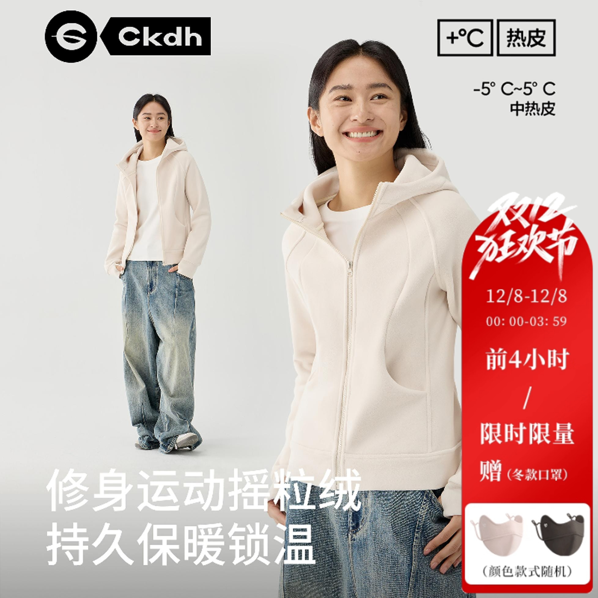 CKDH修身摇粒绒女款户外运动秋冬2025新款卫衣休闲连帽抓绒衣外套