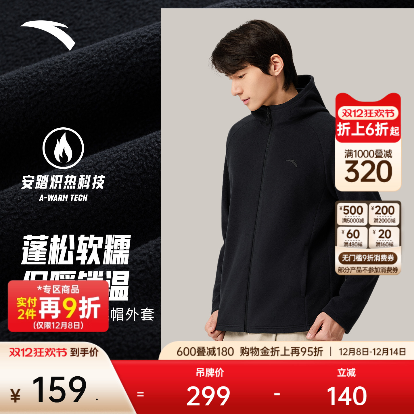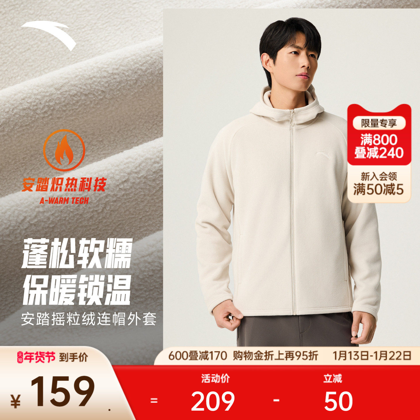 安踏摇粒绒户外抓绒衣男女2025冬季新款连帽外套冲锋衣内胆夹克
