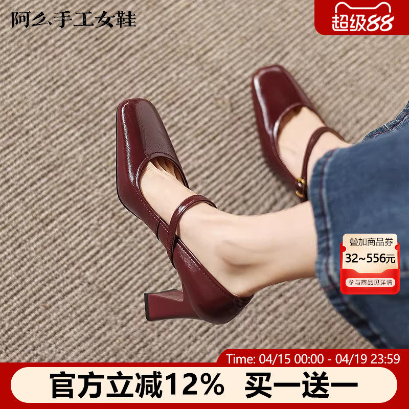 阿么手工女鞋真皮一字带高跟法式玛丽珍鞋粗跟时尚浅口单鞋女正品