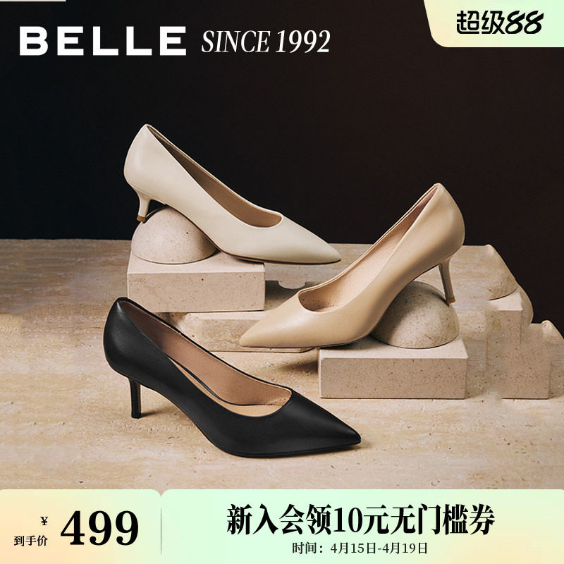 【92系列】百丽真皮黑色裸色细高跟鞋女新款通勤尖头婚鞋单鞋子预