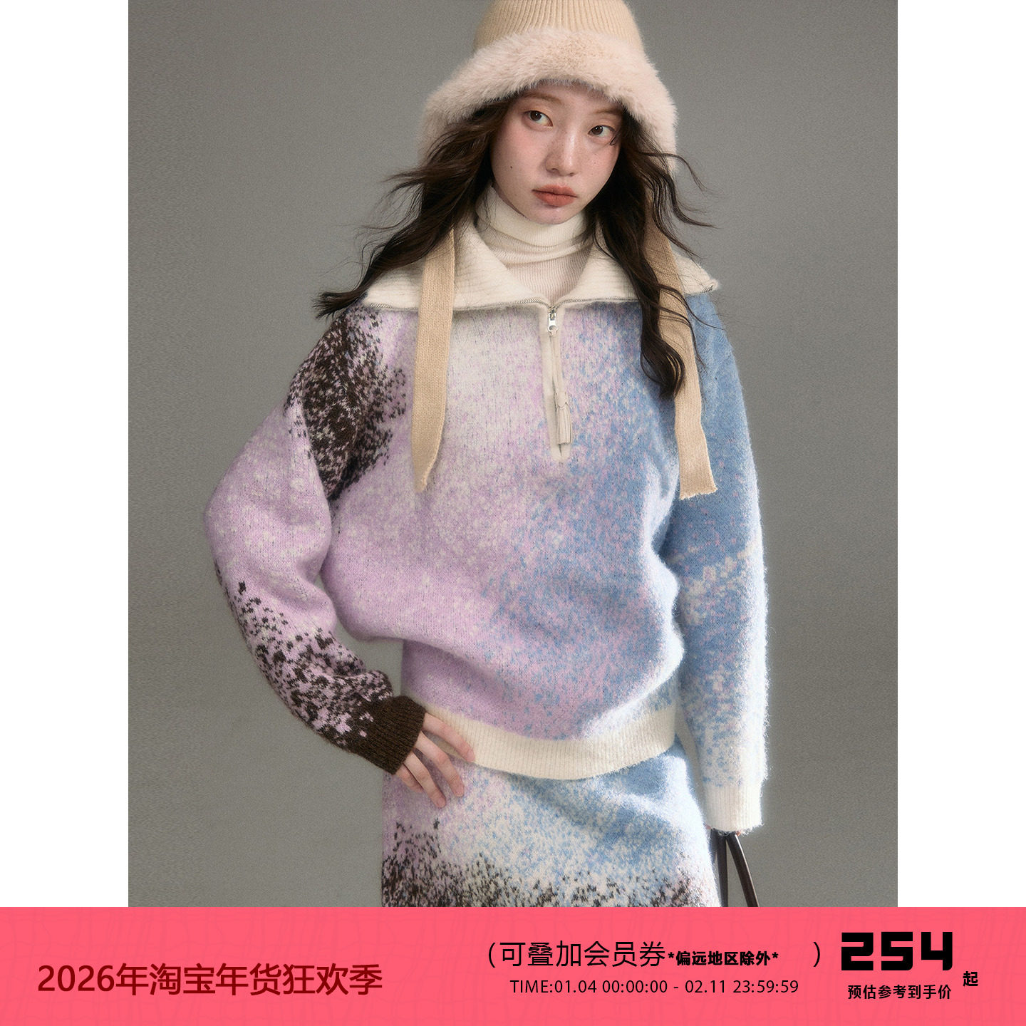 Kroche 冬日暖灰 双拉链 羊毛混纺 植绒小狗毛衣半身裙套装